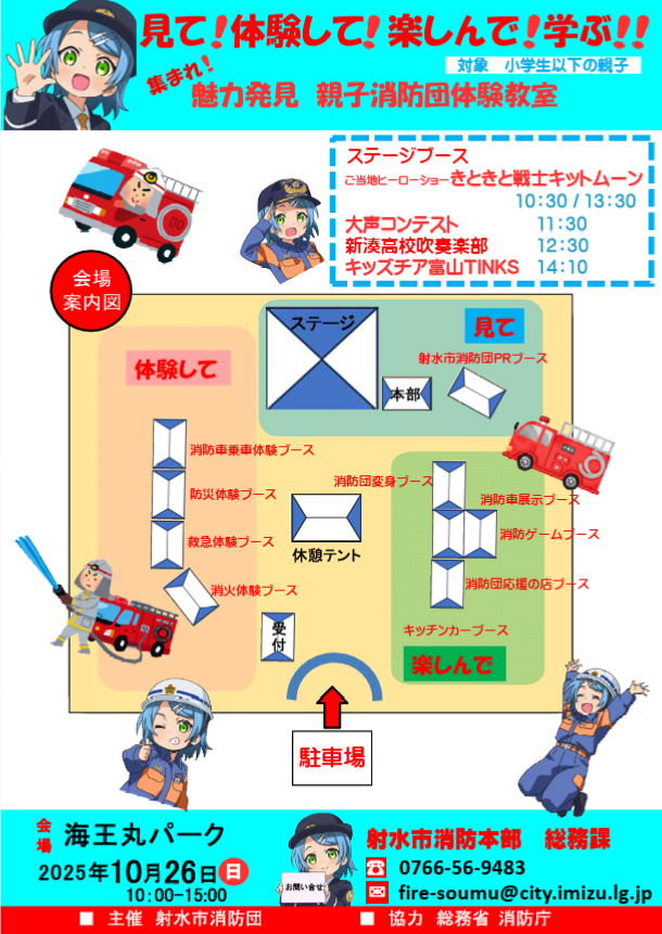 射水市消防団では、楽しく親子で消防団について学んでもらい、消防団をより身近に感じていただくとともに、