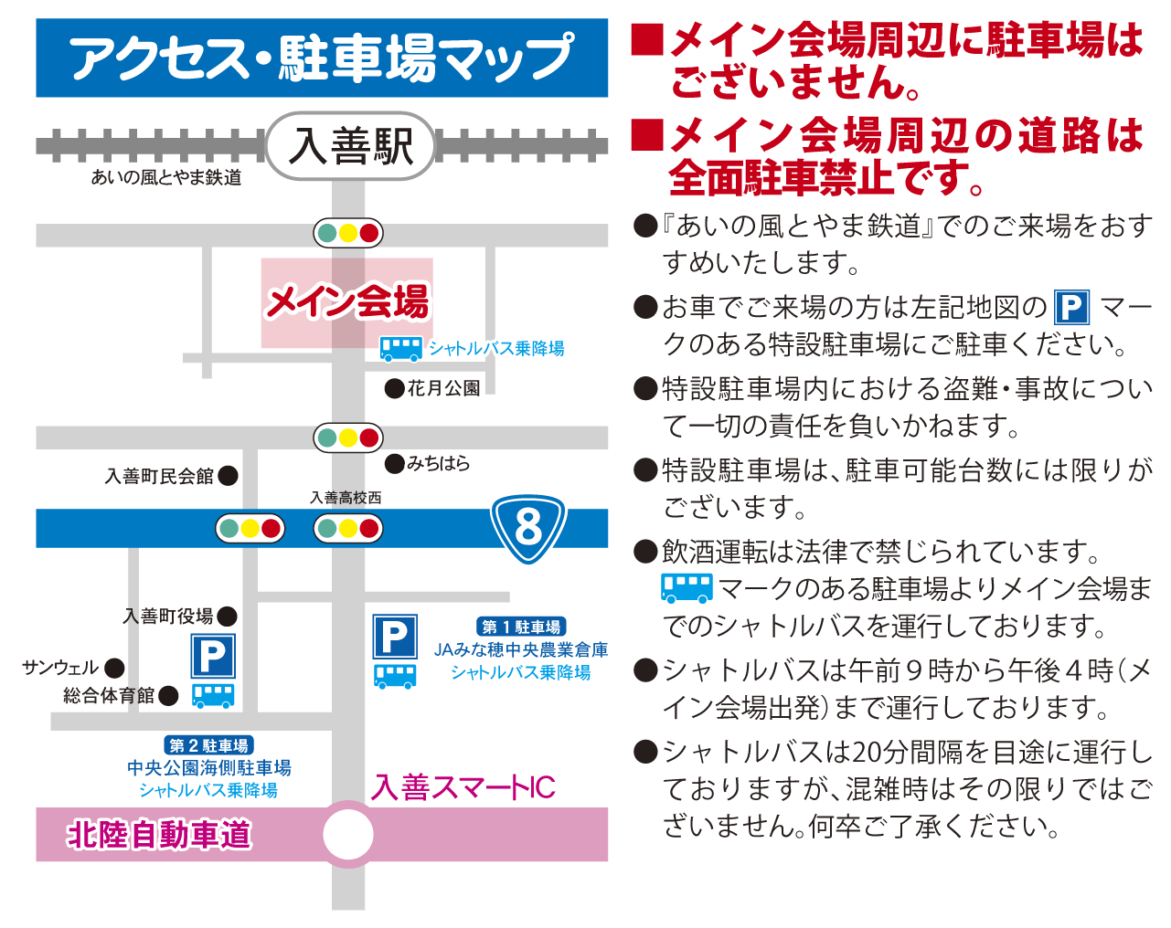 | 駐車場 | メイン会場周辺に駐車場はございません。 |