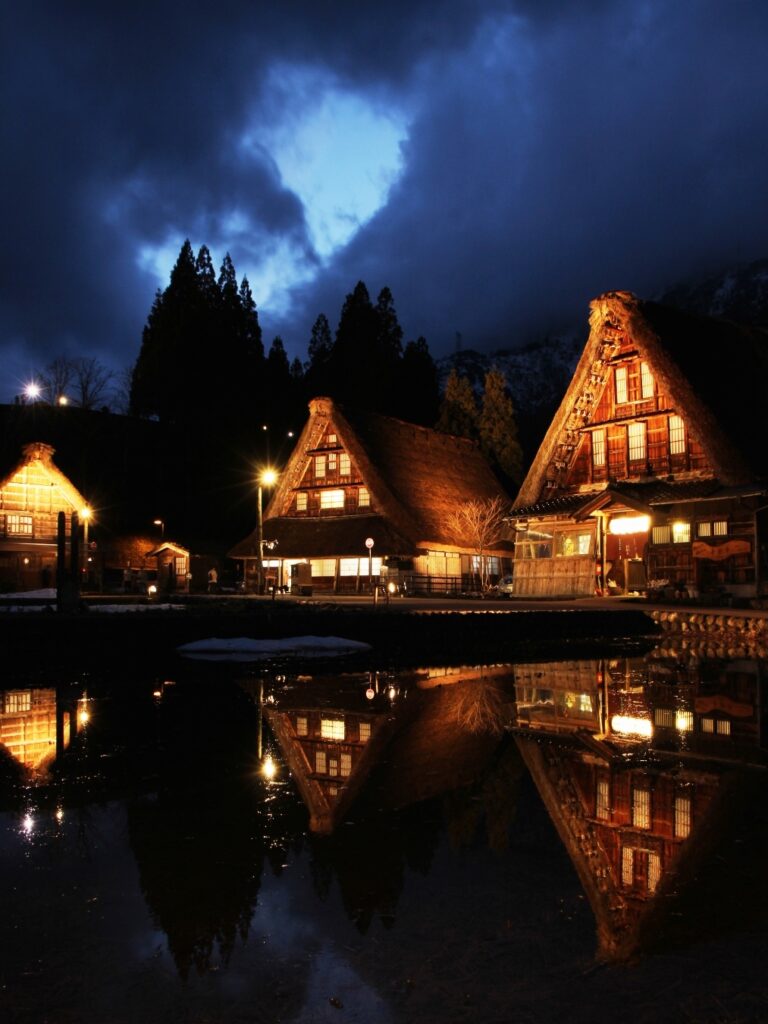 世界遺産 五箇山 菅沼合掌造り集落で、水田に写る逆さ合掌とライトアップは圧巻の... -
